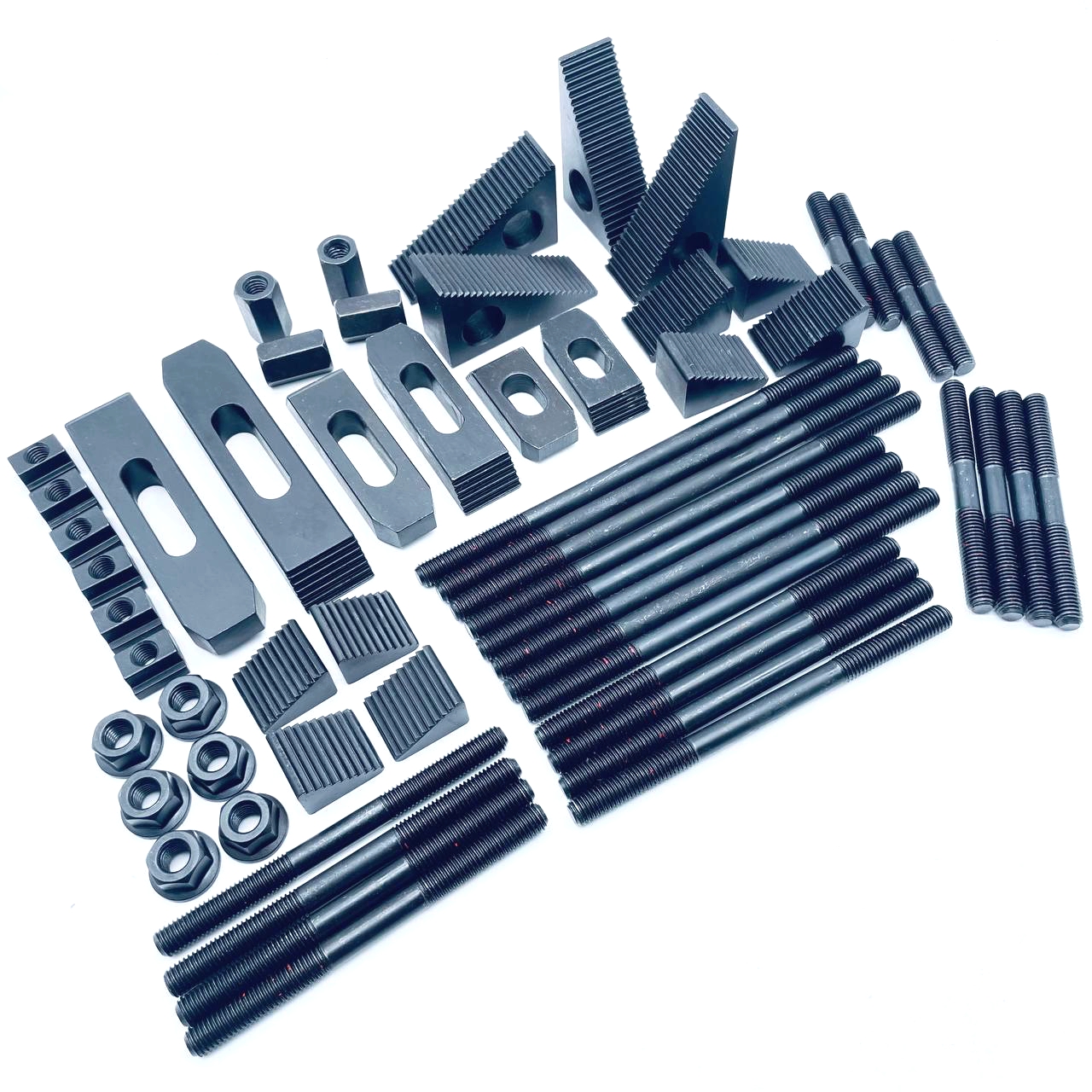 Комплект приспособлений для фиксирования на столах с Т-пазами шириной 12 мм (под шпильки М10). Детали набора изготовлены из стали и упрочнены. Может использоваться на столах фрезерных, расточных, сверлильных станках, обрабатывающих центрах и прочем оборудовании.
