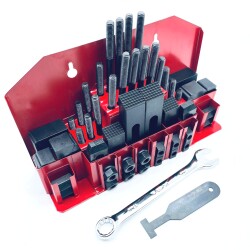 Набор прижимов М18 (58шт) Комплект приспособлений для фиксирования на столах с Т-пазами шириной 19,7 мм (под шпильки М18). Детали набора изготовлены из стали и упрочнены. Может использоваться на столах фрезерных, расточных, сверлильных станках, обрабатывающих центрах и прочем оборудовании. Состав набора Шесть пар уголков "лесенок" различных размеров Три пары прихватов различных размеров Шесть Т-гаек для пазов стола Четые дистанционные гайки Шесть зажимных гаек По 4шт шпильки шести разных длин Подставка для размещения деталей набора