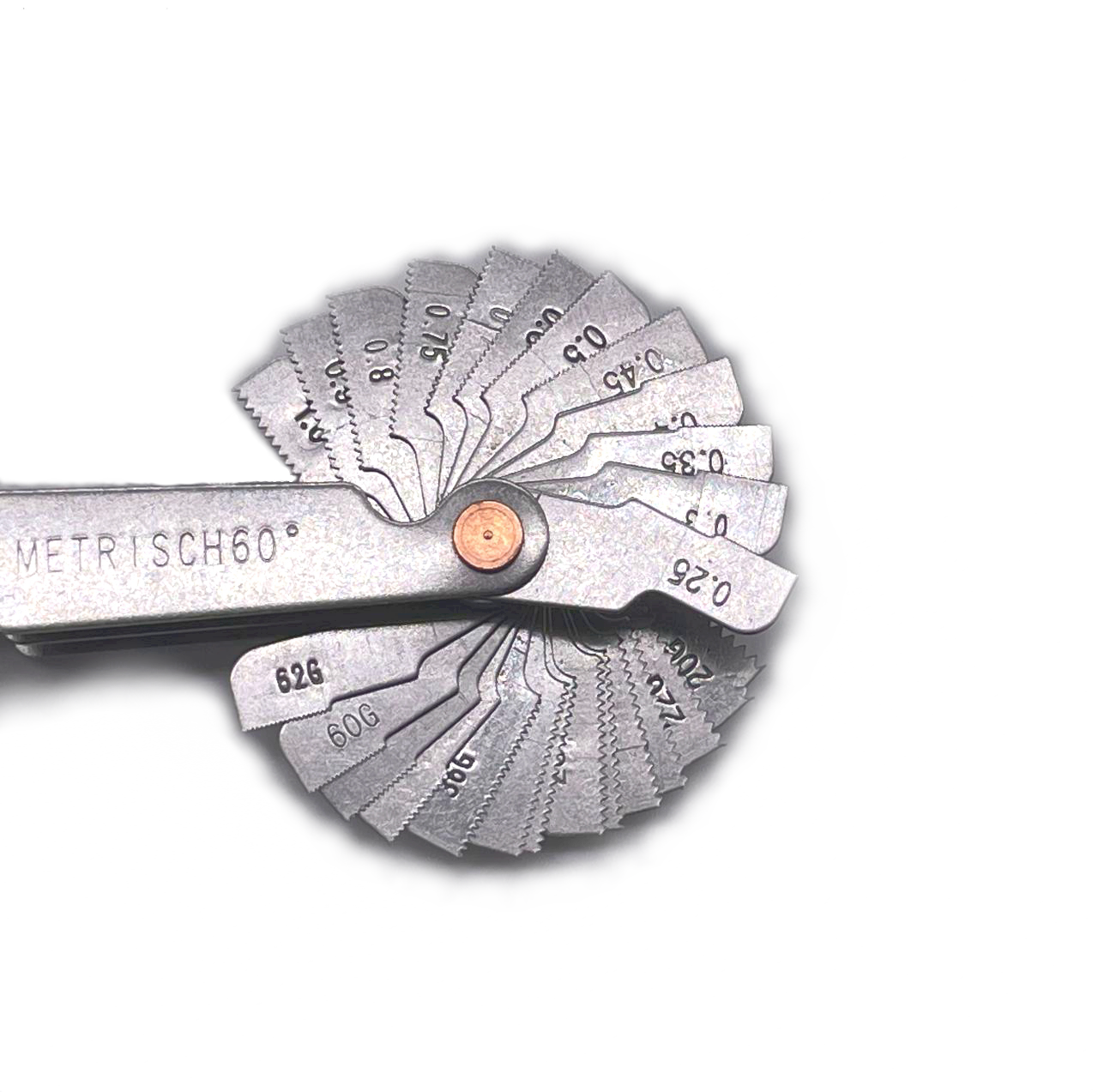 Резьбомер представляет собой набор из 24 эталонных шаблонов, используемых для определения шага метрической резьбы и из 28 эталонных шаблонов для определения шага дюймовой резьбы.